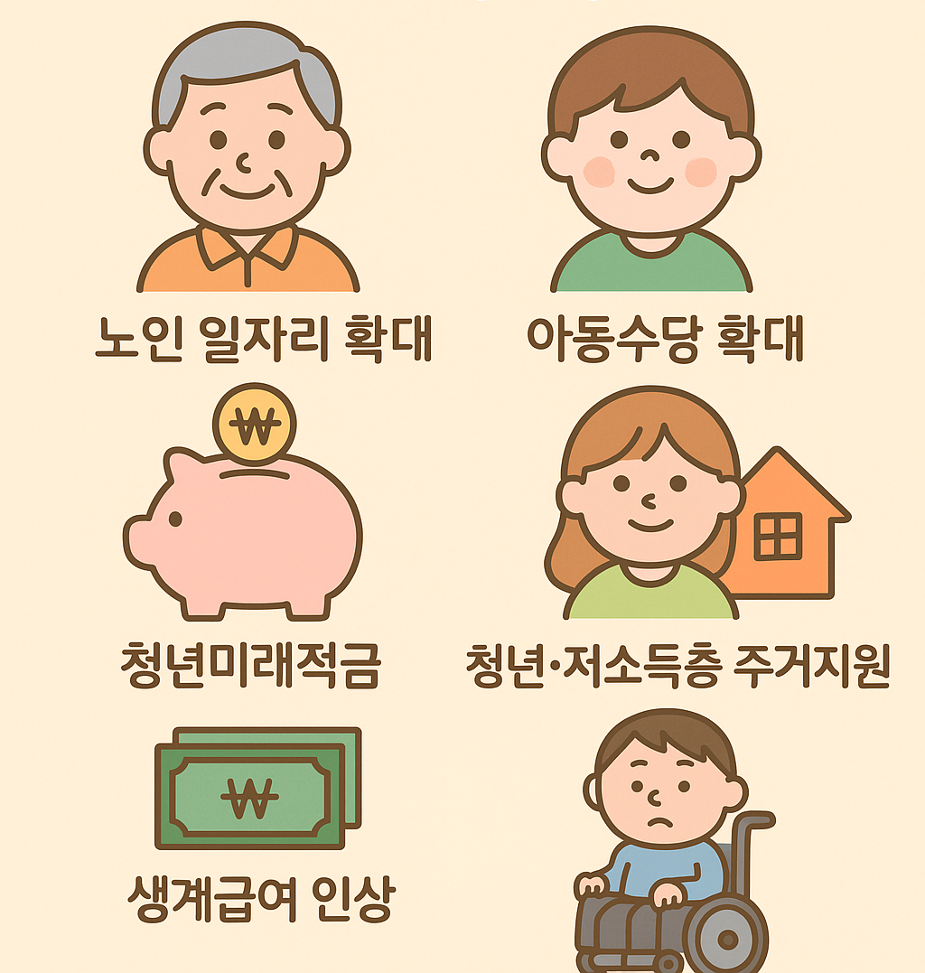 | 장애인 복지 | 활동지원·일자리 확대 | 활동지원 시간 확대 / 구직·교육 수당 인상 |